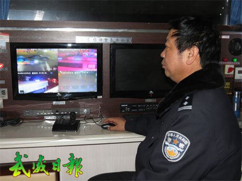 1月10日訊 民警在移動警務室監(jiān)控街面情況。涼州公安分局東大街派出所自設立流動警務室以來,轄區(qū)的治安秩序好轉(zhuǎn),警情案件下降,服務群眾效果不斷顯現(xiàn),警民關(guān)系不斷融洽,受到轄區(qū)居民及企事業(yè)單位的好評。