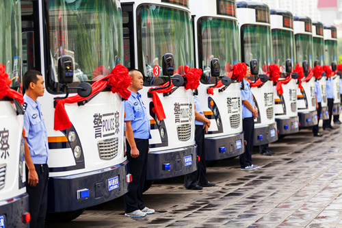 山西呂梁 12臺新型移動警務(wù)室交車啟動儀式