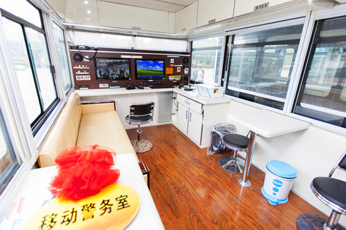 新配發(fā)的移動警務(wù)室交內(nèi)安裝有智能化警務(wù)辦公指揮系統(tǒng),可隨時傳輸在外執(zhí)勤人員的信息,遠(yuǎn)程調(diào)度指揮移動警務(wù)室執(zhí)勤路徑。流動警務(wù)室車頂配有可升降360度旋轉(zhuǎn)攝像頭,高清150米監(jiān)控,夜間可用紅外線等信息采集設(shè)備。當(dāng)110接到報警電話后,可同步快速搜索報警地點附近的流動警務(wù)室,并發(fā)送調(diào)度短信,實現(xiàn)快速出警;鶎右痪執(zhí)勤人員可以利用移動警務(wù)室,實現(xiàn)多功能移動辦公,不僅可以隨時為群眾提供零距離服務(wù),還能迅速深入一線開展巡查工作,大大提升了執(zhí)勤執(zhí)法效率,為順利完成各項公安業(yè)務(wù)工作提供了強有力的保障。